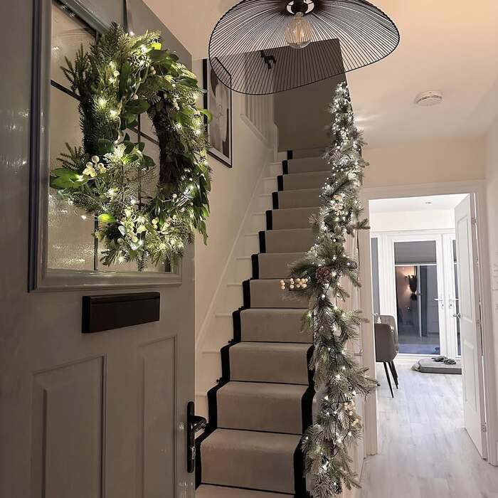 Last, a small-scale hallway with a slim frosted garland marching up the banister. The wreath on the door glows too, which sets the tone the second you walk in. Tight spaces can look cluttered fast, so I keep decor skinny and bright, not bulky. I once used a thick garland here and it stole elbow room.