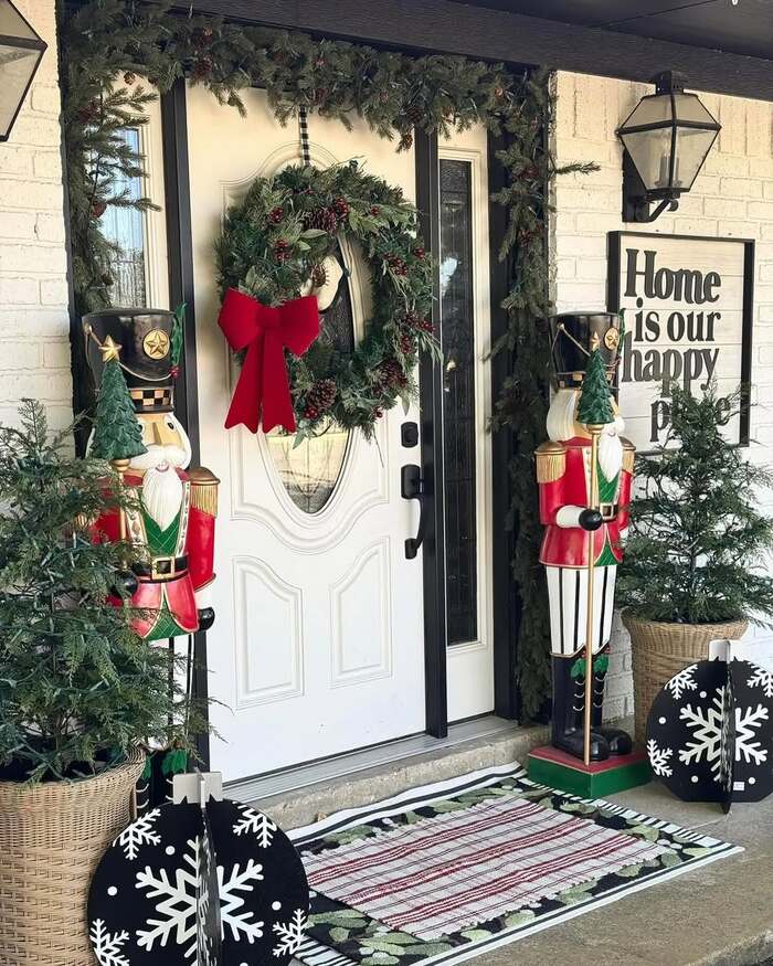 This idea is the simpler cousin, but not boring at all. A thick garland lines the door frame, a round wreath with a red bow sits at eye level, and two little evergreens in baskets flank the entry. The nutcrackers are smaller here which I think is perfect for a regular porch. The welcome mats stack for texture and color.