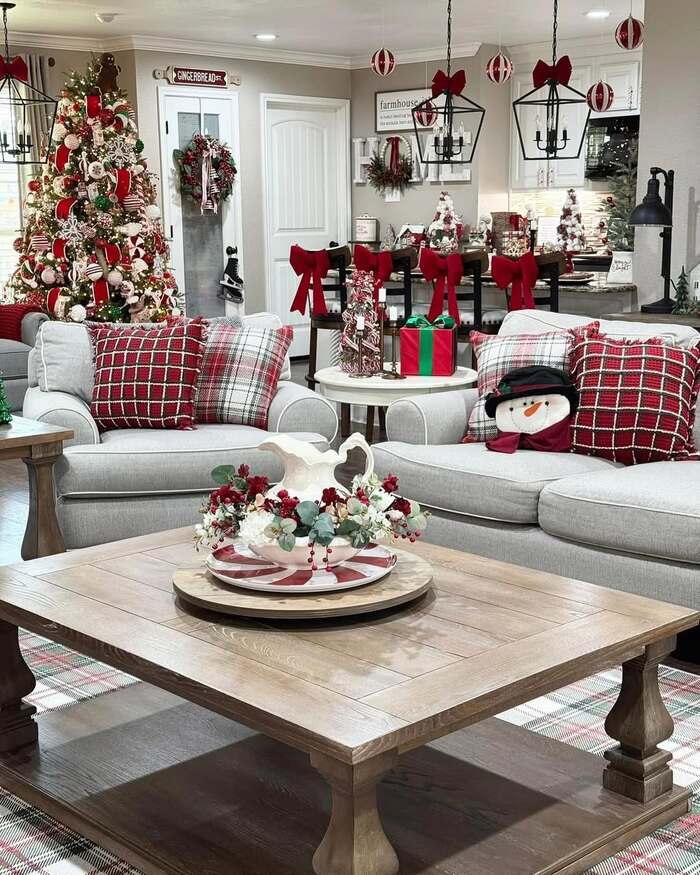 Inside, this family room mixes plaid pillows, ribbon wrapped chandeliers, and a tree loaded with ornaments that look like peppermint candy. The garland idea here is more subtle. It runs across doorways and the kitchen window trim, tying the open layout together. I love this because it keeps the party feeling without adding clutter to every surface.