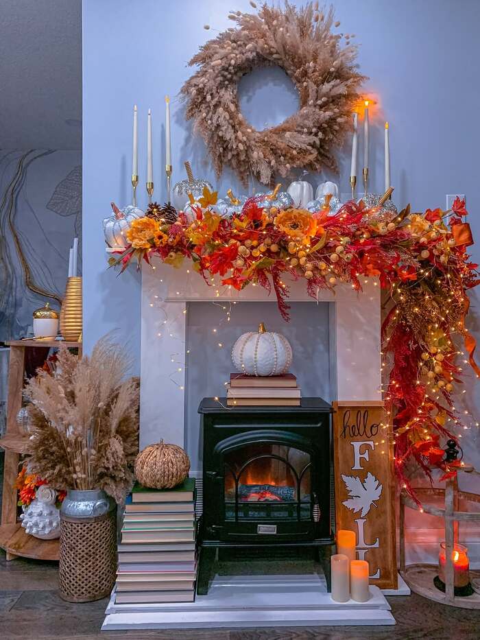 To adapt this into garland ideas for the holidays, layer cedar or pine branches into the existing fall garland. Keep the warm copper fairy lights but switch pumpkins for gold ball ornaments. A trick I love is slipping cinnamon sticks and dried orange slices into the mix. It smells like baking and costs almost nothing. If your mantel isn’t deep, use low-profile stems and secure everything with floral wire. This is a cozy bridge look for those of us who aren’t ready to rush winter on day one.