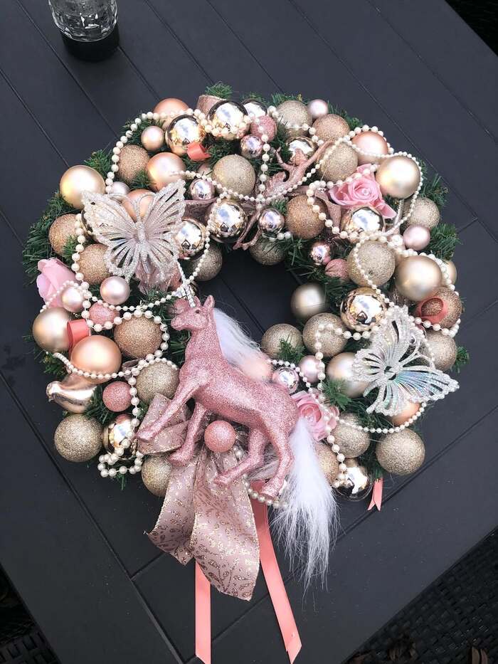 Not technically a garland, but it pairs perfectly with one. This wreath is packed with champagne, rose gold, and blush ornaments, then finished with small pearls and a glitter unicorn. It’s whimsical, fancy, and kind of fearless. My niece saw it and said, “that’s mine,” which is honestly the best review.