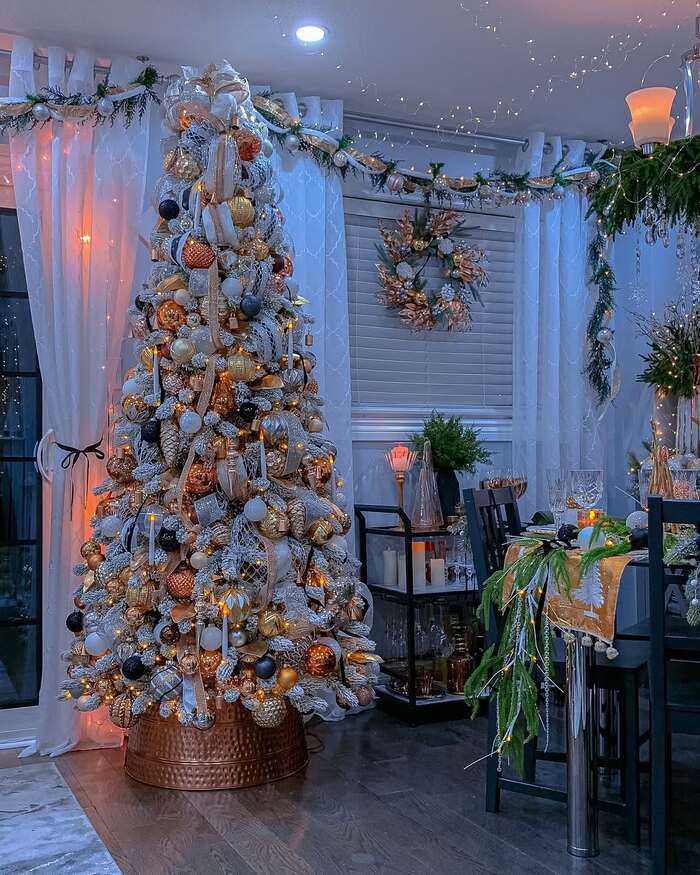 This dining area is glam and cozy at once. The tree is packed with ornaments in copper, silver, black, and creamy white. Over the window hangs a layered wreath that peeks from behind gauzy curtains, while a slim garland trails across the drapery rod and over the table runner. The whole room glows like candlelight even with the overheads off.
