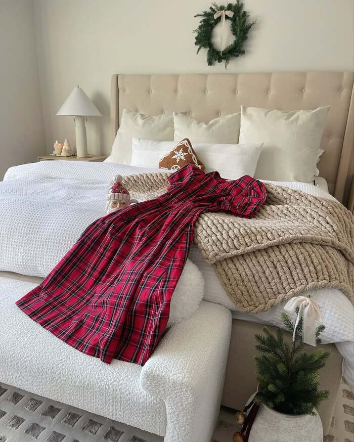 This last room is the definition of quiet welcome. A soft beige bed, knit throw, tiny potted tree near the bench, and a simple wreath tied with a ribbon. The plaid dress laid out feels like movie magic and also a smart styling trick for arrival photos. For a christmas guest bedroom that feels spa level, stick to creamy whites and one warm neutral. The small tree adds just enough festive shape.