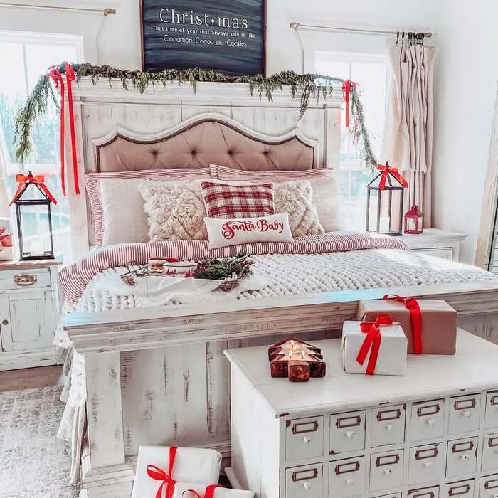 This look comes to play. Distressed white bed, chunky knit blanket, and red ribbons tied to simple garland. Pillows mix stripes, sherpa, and a cheeky “Santa Baby” lumbar that made my sister laugh out loud. Gifts wrapped with velvet bows on the cedar chest double as decor and also remind me to actually give them. The symmetry of lanterns on both nightstands calms the bright color.