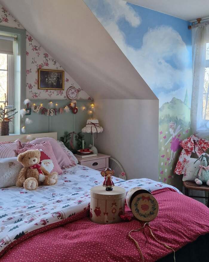 This attic nook might be my favorite because it’s imperfect and sweet. There’s floral wallpaper, a sky mural on the sloped ceiling, and twinkle letters that spell Christmas. Bedding mixes candy-stripe pillows with a winter scene duvet. The old-fashioned boxes on the bed hold tiny surprises for each night. My niece called it a sleepover dream and I melted a little.