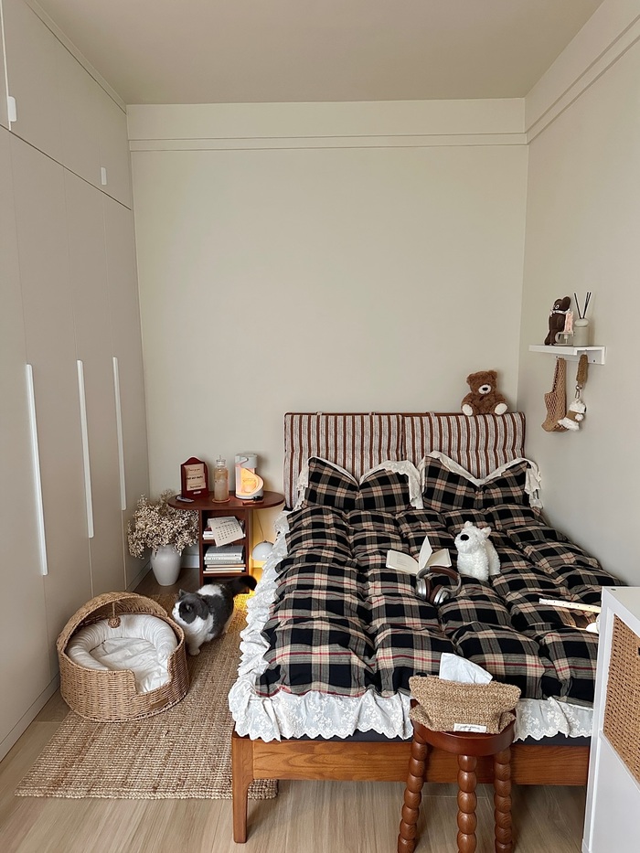 This last room is made for real life. Plaid comforter with lace trim, striped headboard, natural jute rug, and warm wood furniture. The cat bed next to the nightstand made me clap because yes, our furry freeloaders are guests too. Neutral walls keep everything calm while small stockings on the shelf add holiday charm without taking space. It’s tidy, but not stiff.