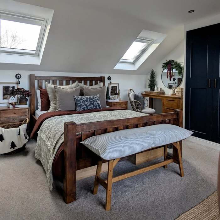 The second space feels like a tiny mountain inn. Warm wood bed, sloped ceiling, and black wardrobe for contrast. It’s simple, but not boring. For a christmas guest bedroom tucked in an attic, keep decor low and cozy. A small tree on the desk repeats the triangle shape from the ceiling and makes the room feel intentional. The wreath above the round mirror is a smart move, because it adds green at eye level without stealing floor space.