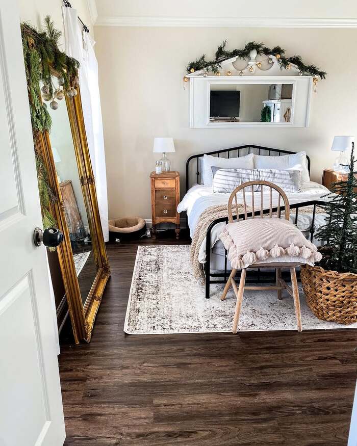 A lean floor mirror dressed with greens is basically a second window. It reflects the bed and tree, doubling the glow. This minimalist space uses an iron bed, soft whites, and a single woven basket with a real-looking tree. For a christmas guest bedroom, reflection is a cheat code. Put the tree where the mirror can grab it, then go easy on the ornaments so it stays airy. The little chair with a pom pillow at the foot is a nice landing spot for bags.