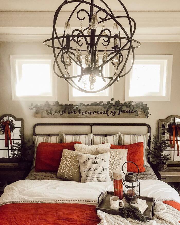 Bold chandelier, red pillows, lantern on a tray, and the sweetest script sign resting on eucalyptus. This is a moodier, grown up christmas guest bedroom, and I’m into it. The windows throw light on the textures so the whole bed looks like a warm latte. Two small trees sit on the nightstands and tie the symmetry together. If you try this look, keep your sheets fresh white so all the warm tones pop.