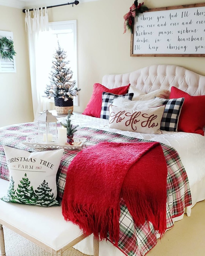 Plaid is a shortcut to holiday charm, but this room shows how to keep it light. The quilted throw, ho ho ho pillow, and a tiny tree set in a basket all sing the same note without shouting. If I were styling my christmas guest bedroom like this, I’d start with bright white bedding, then add one plaid layer like a tablecloth folded as a bed scarf. Cheap and it works.