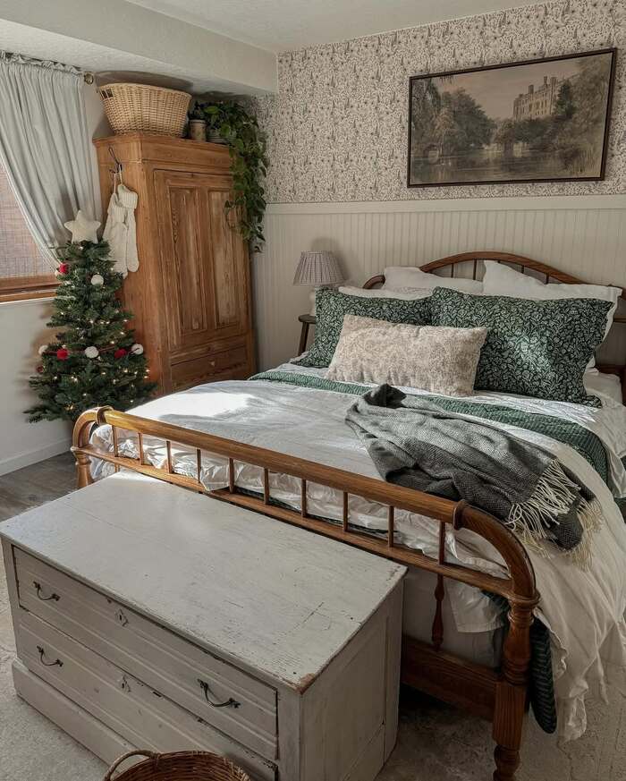Here the star is pattern mixing that still feels restful. A dainty wallpaper pairs with solid green pillows and a warm wood armoire. The tiny tree sits by the closet and wears simple red ornaments. In a christmas guest bedroom with lots of vintage wood, aim for natural greens, not too much sparkle. The white chest at the foot becomes a handy luggage table, which guests appreciate more than they’ll ever say.