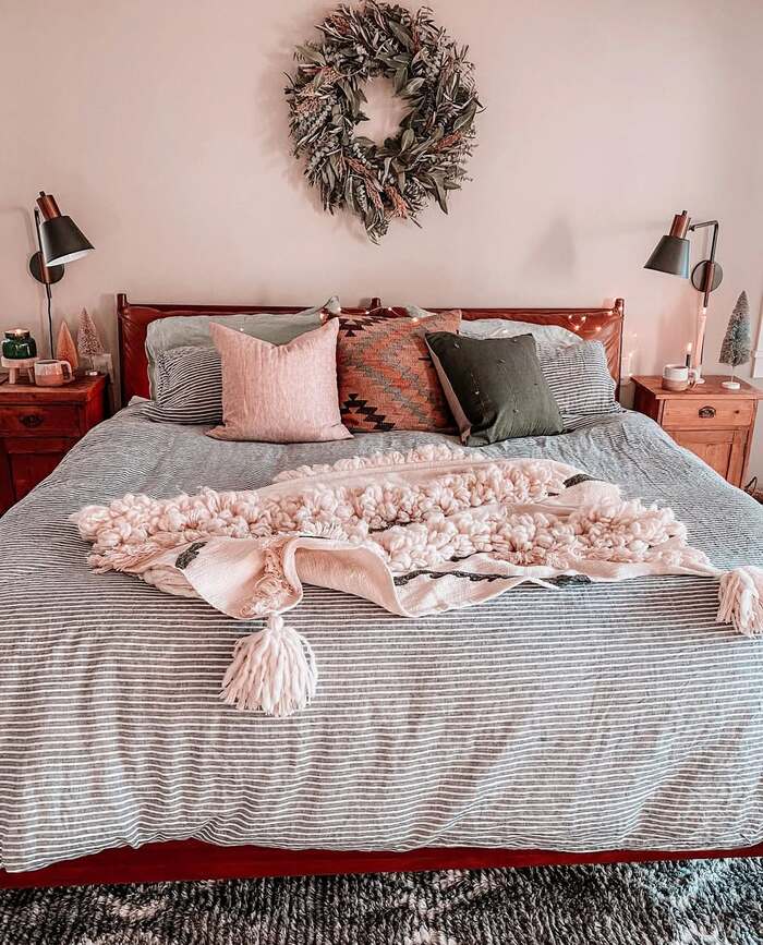 Not every christmas guest bedroom needs a full tree. This clean modern room uses a single sage wreath above the bed, a wool throw with chunky tassels, and tiny bottle brush trees on the nightstands. It whispers holiday without taking over. If you love calm mornings, copy this. Keep bedding tonal, like gray stripes under a creamy blanket, then pop in one warm terracotta pillow so it doesn’t go flat.