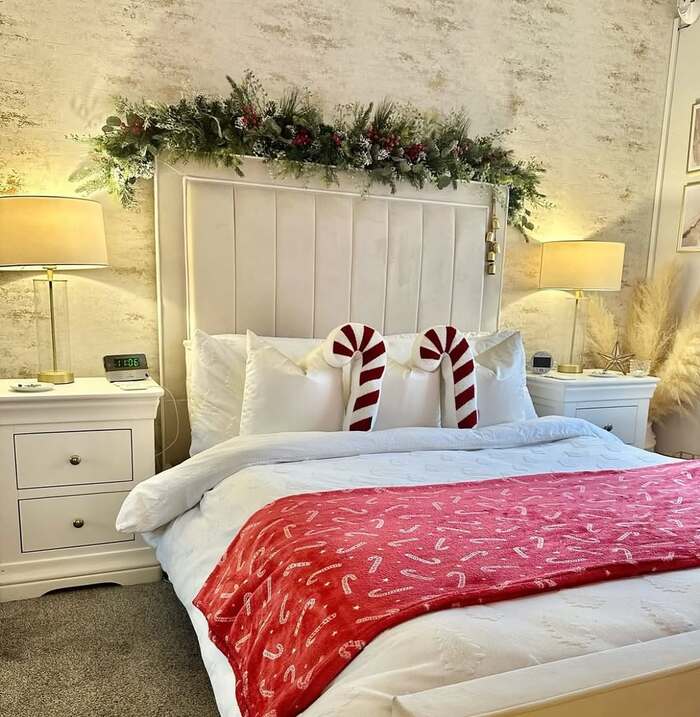 Playful and polished at the same time. A crisp white bed with vertical channeled headboard, a frosted garland above, and two candy cane pillows that make kids and adults smile. For a christmas guest bedroom with hotel freshness, keep everything snow white then add one red story. Here it’s candy canes and a dotted red throw. Lamps with warm shades bring the glow that pure white often needs.