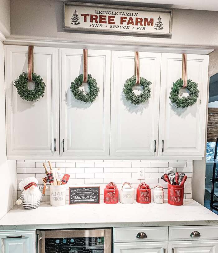 Sometimes the simplest lineup wins. A vintage-style Tree Farm sign floats above three crisp white cabinet doors, each with a small wreath hung on gingham ribbon. Down on the counter a row of labeled canisters and a chalkboard sign makes the baking zone ready to go. The best part of this design is how graphic it feels. Big words up top, simple circles below. My brain goes ahh.