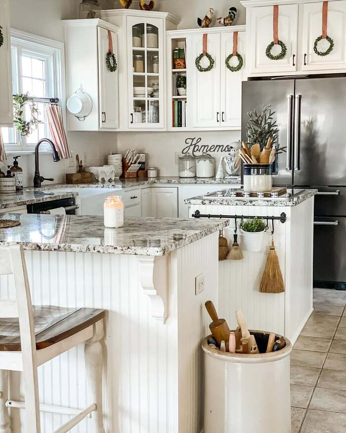 This all white kitchen is a sweet lesson in repetition. Small faux greenery wreaths hang across the upper doors, each tied with twine or oatmeal ribbon so the look feels farmhouse and not fussy. The trick that made me gasp a little is how the green repeats around the room. A garland nest on top of the microwave surround, tiny trees near the sink, and a “Christmas” banner tucked by the window bring the whole cabinet wall to life without clutter. I like that the island stays clean so moving around is easy.