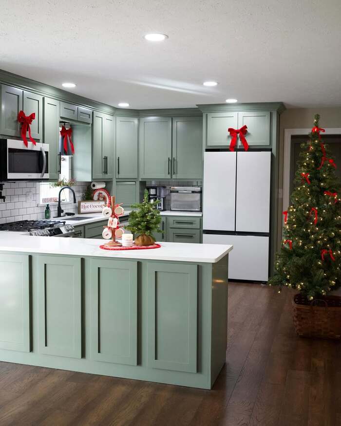 I didn’t think green on green could feel this cheerful, but the red bows changed my mind. Soft sage cabinets meet a matching island, and big red velvet bows clip right to the upper doors. It’s playful without chaos because the rest of the palette is quiet. The tree in the corner repeats the red and the lights bounce off the white counters like frosting.