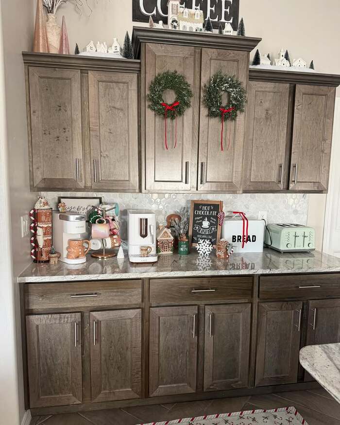 Coffee station with wood cabinets, paired wreaths, and gingerbread village