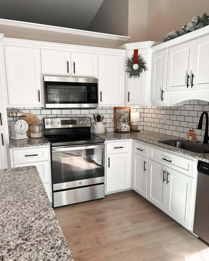 Not every kitchen needs a lot. This one proves restraint can sing. White shaker cabinets, black hardware, and classic subway tile create a crisp backdrop. The holiday layer is light. A single small wreath hangs with red felt ribbon on one cabinet, and a frosted garland runs along the very top ledge. When the evening lights come on, that frosted edge reads like fresh snow.
