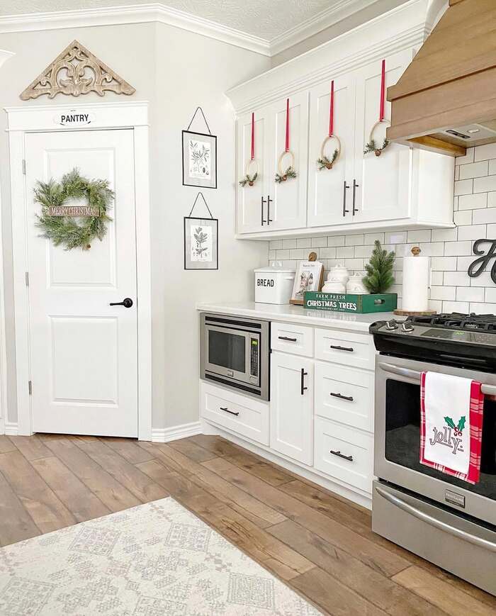 This bright kitchen uses repetition like a pro. Three mini hoop wreaths hang from bold red ribbons across one short run of uppers. They line up perfectly, which makes my brain happy. The pantry door wears a larger wreath so the whole corner reads as one composition. On the counters, the decor stays low and graphic with a “Fresh Christmas Trees” tray and a few neutral jars.