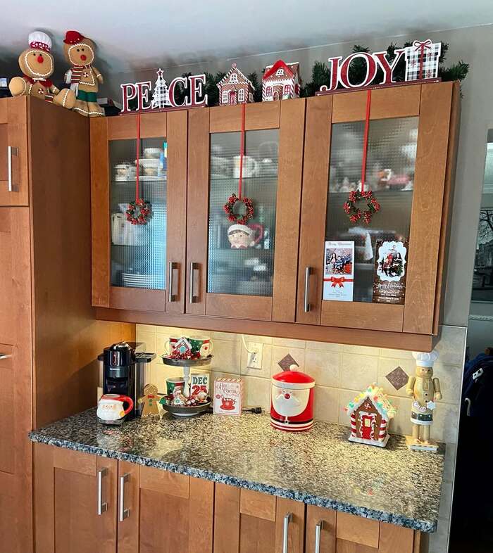 Warm wood cabinets with textured glass fronts already have charm, and the holiday layer just turns up the cozy. Micro wreaths hang from red ribbon on each glass door. Up top, the cabinet crown becomes a stage for marquee letters that spell PEACE and JOY, plus little ceramic houses with green tuck-ins. I’m a sucker for height changes because they make your eye dance. The counter becomes a coffee and cocoa station with a tiered tray, a Santa canister, and gingerbread buddies. It’s cheerful and also functional, which I will never stop preaching.