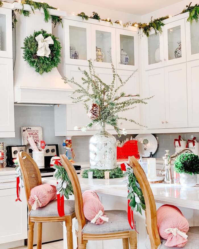 This space feels airy and elegant, like a holiday brunch is always five minutes away. The cabinets wear a long garland with soft bends and gentle tails at the corners. No big bows here, just a quiet glow with fairy lights tucked in. A green wreath with a white bow on the range hood becomes the focal point, while the island chairs get mini wreaths tied with red ribbon. Is this technically about cabinets? It is, because they frame the story and give you the best places to anchor greenery.
