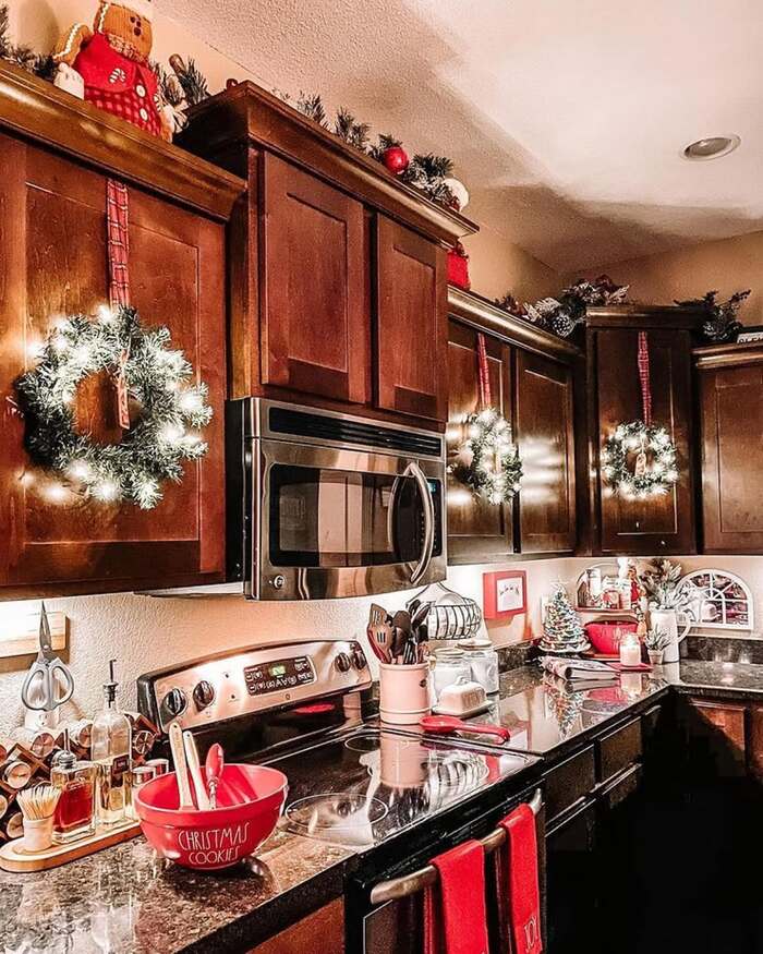 Dark stained cabinets get moody in the best way when you add lit wreaths on each door. The ribbon is plaid and a little rustic, which warms up all the rich wood. A thin garland sits on top of the cabinets with classic red ornaments. I swear the glow makes the countertop look like chocolate. If you cook at night, this is the move. The reflection of the mini lights in the microwave door is pure movie scene.