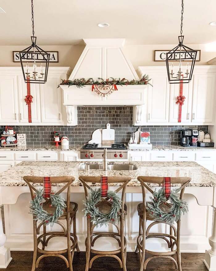Granite counters, white bead board details, and big lantern pendants give this kitchen sweet old-meets-new vibes. The cabinets keep the theme clean with a short garland and a mini banner that says Merry Christmas across the hood. Sometimes we overthink and start adding a thousand tiny things. Not here. The smart play is adding plaid bows to the stools and echoing that ribbon on cabinet pulls or the hood banner. Your eyes get a path to follow.