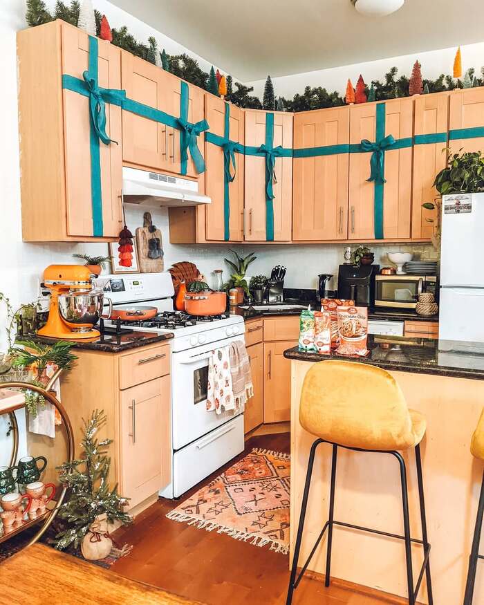If you have colored cabinetry, lean in. Use complementary ribbon so your Christmas kitchen cabinet decor feels intentional. I like spring clamps on the back of the doors to hold ribbon taut. On the island, add a mini tree on a cake stand to pull your eye forward. Keep your appliances and utensil jars neat so the bows stay the star. This is a great example of festive kitchen cabinet decorating ideas that make a room feel happy the second you flip the lights on.