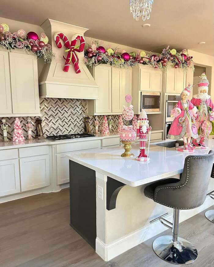 christmas kitchen decor ideas cabinets: Candyland pink garland and oversized ornaments