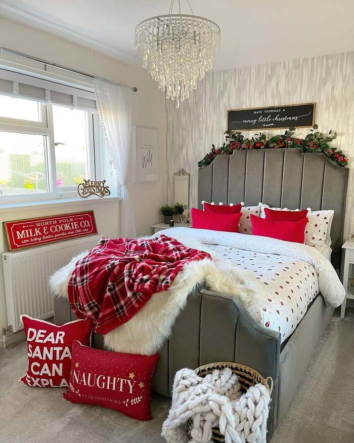This one feels like sugar cookies. A gray upholstered bed, bold red pillows, dotted sheets, and a garland hugging the headboard. The chandelier rains crystals without feeling fussy. The smart move here is how the lights sit at two levels. Overhead crystals twinkle, then the garland adds mid-level glow right where your eyes want comfort.