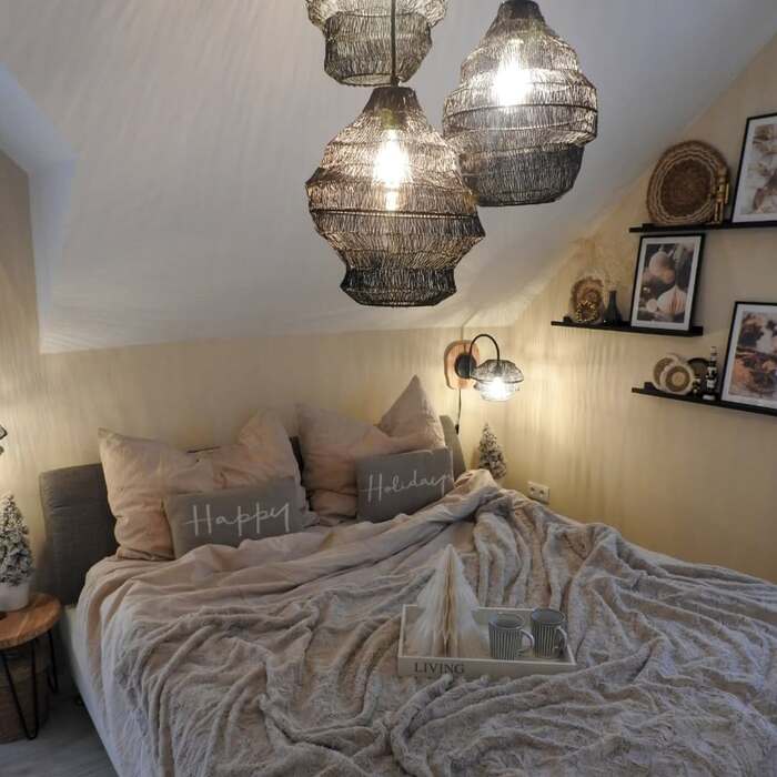 If your space is low and slanted, think layers not watts. Put dimmable LED bulbs in the pendants and cap them at 40 percent. Then tuck a string of fairy lights behind the bedhead or under the shelf lip. That hidden line creates a halo and it’s so flattering in selfies, sorry but true. Add one candle lantern at the foot of the bed for a third glow point. That gives you holiday lights in the bedroom that feel grown up and restful.