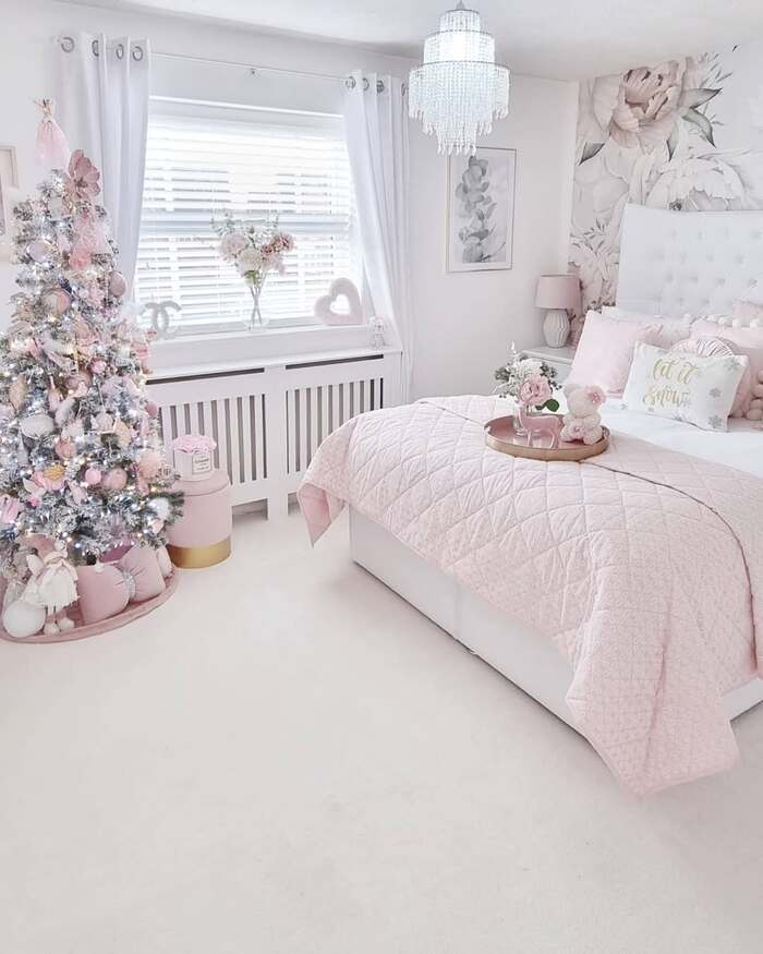 This room is sweet in the softest way. White walls, floral mural, blush quilt, and a full pink tree sparkling by the window. The chandelier sprinkles light but the tree is the star. It’s proof that twinkle lights in the bedroom can lean pastel and still read festive. My opinion. It’s perfect for teens or anyone who loves a quieter palette.