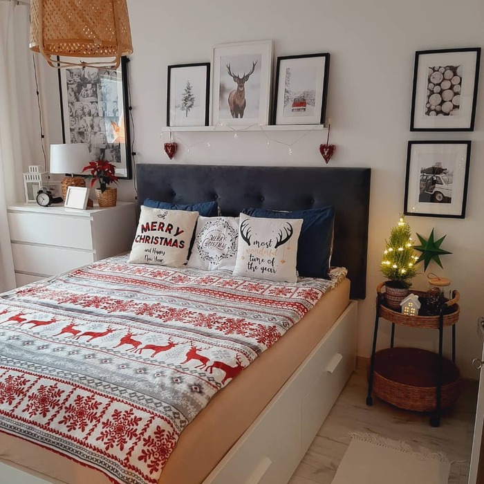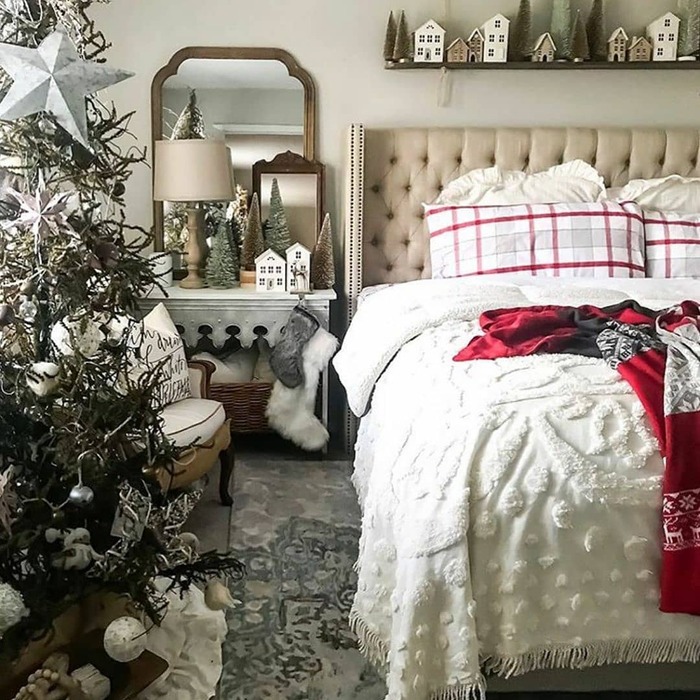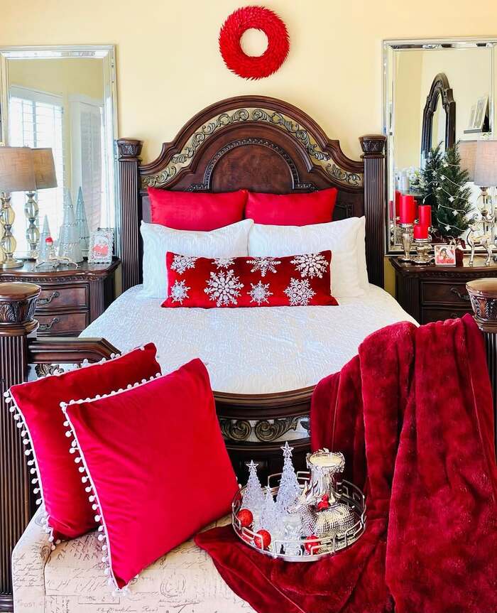 This last idea is calm and crisp. An iron bed pops against white bedding and neutral walls. A frosted garland with pinecones runs along the footboard with a single warm light strand. Three red pillows and a tiny snowflake lumbar give enough color. A mirror with a red bow over the lamp repeats the holiday note without clutter. The garland placement at the foot is smart. You enjoy the glow without direct light in your face.