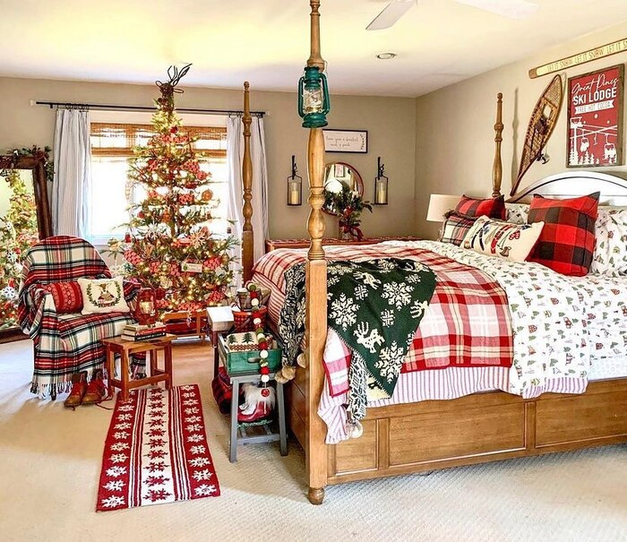 This close-up is a styling master class. A black lantern with a candle and berry greens sits on a woven tray, while the bed behind wears a red knit throw, plaid pillows, and a garland arching over the headboard. Light shows up in small, thoughtful spots rather than one big blast. It feels intimate and handmade.