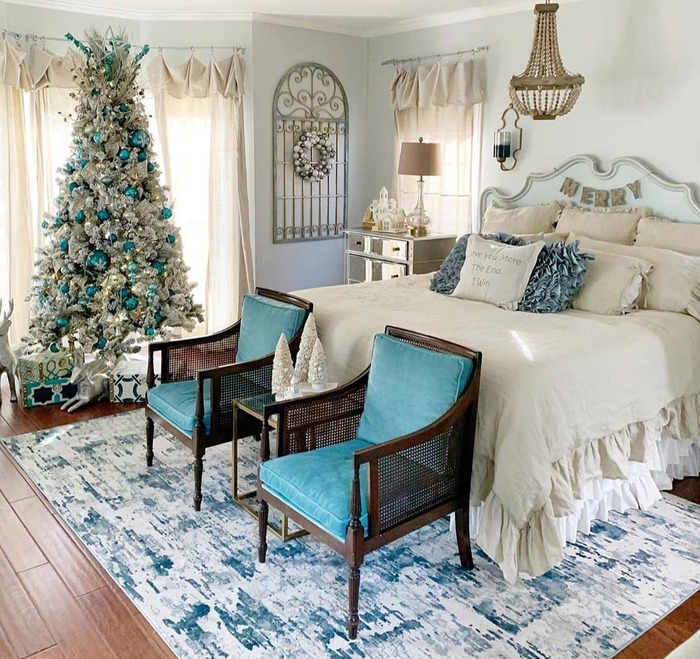 This room surprised me. The teal chairs and icy tree felt fancy but not stiff. The tree gets cool-toned LEDs, then teal and silver ornaments that bounce the light like lagoon water. No joke, it looks calm even with lots of shimmer. A mirrored dresser and metallic headboard details reflect light into the corners, which helps big rooms feel full. If you lean coastal or love blue, this is your lane.