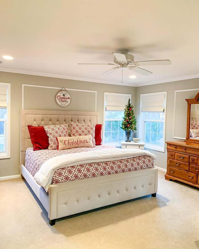 Sometimes simple wins. A tufted beige headboard, red and cream fair isle sheets, and one tabletop tree on the nightstand. That’s it. Over the bed hangs a round sign and between the windows the light is bright by day, then the tree takes over at night. The small scale tree is underrated. It gives the vibe of Christmas lights for bedrooms without the footprint of a full size tree.