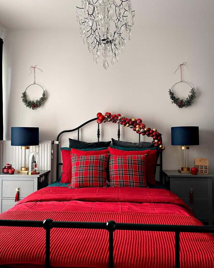 Hello drama. The black metal bed and crystal chandelier frame a strong red quilt and plaid pillows. I draped a garland made from ornaments across the headboard rail and tucked in a short strand of lights. The wall has two tiny wreaths that echo the curve. Blue lamps add contrast and a little grown up vibe. This is a masterclass in Christmas bedroom lighting when you like color that actually pops.