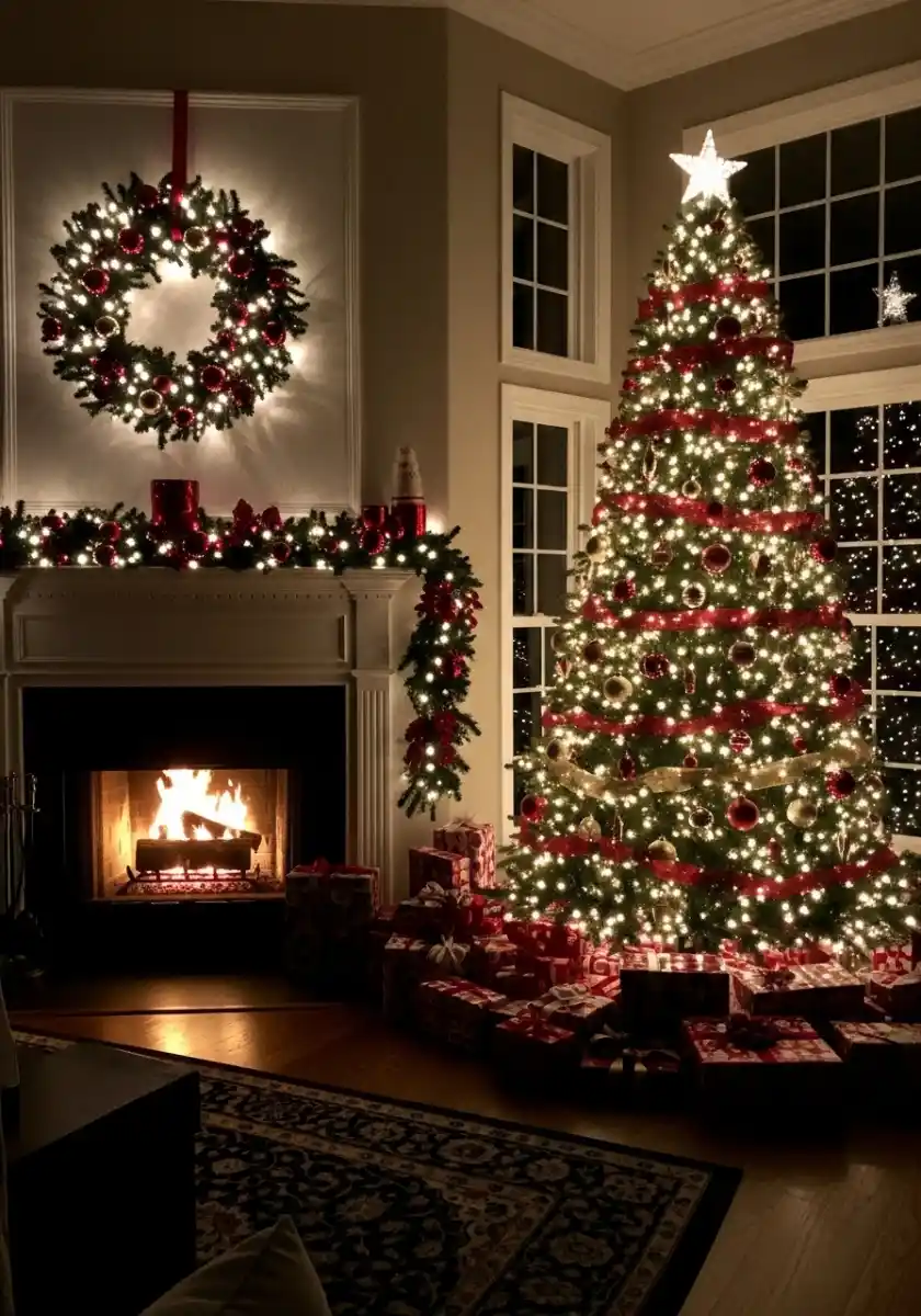 This design is the opposite of fussy. The white fireplace, soft garland, and a tree wrapped with red ribbon in loose diagonals feels timeless. I set battery candles along the mantel but mixed one or two tea lights for a tiny flicker variation. The wreath above the mantel keeps things symmetrical, which is relaxing after a long day.