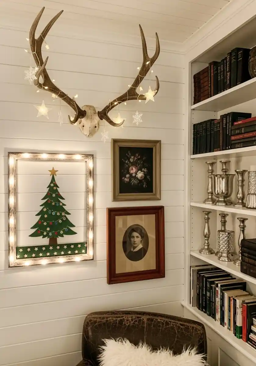 This last scene feels like a winter reading nook. I hung a framed felt tree art piece with a border of little bulbs, then loosely draped star lights across antlers on the wall. Sounds odd, looks very charming. The metallic candlesticks on the bookshelf mirror the string lights, so the whole corner glitters in a quiet way.