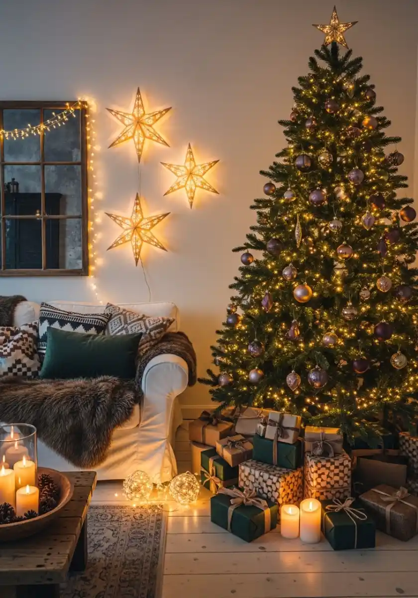 This scene starts with three glowing star sconces above a sofa, a mirror draped in fairy lights, and a tree decked in warm white. The stars are the secret sauce. I mounted lightweight paper star lanterns and used low watt LED bulbs so they glow like butter instead of glare. Keep the cords straight and tape them down the corner so they vanish. On the coffee table, I used a big glass hurricane with pinecones and three candles to echo the warm tone.