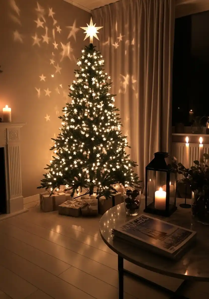 I’m obsessed with how the mini star bulbs cast shadows on the wall and curtains here. To recreate it, use star cap covers over your living room Christmas lights and place the tree about two feet from a plain wall. The distance lets light spill and paint those soft star shapes. I turned off the ceiling light, kept only lanterns and a few candles on the table, and the whole room felt like a sleepy snow globe.