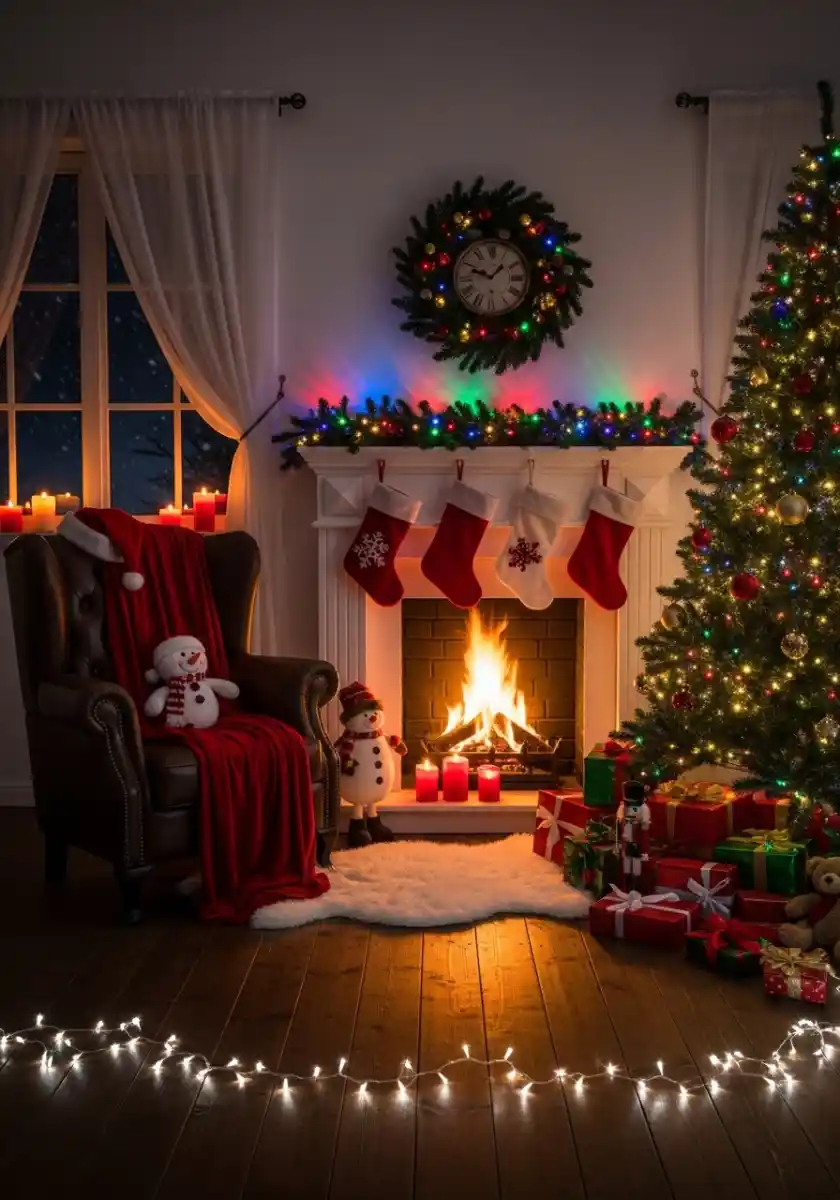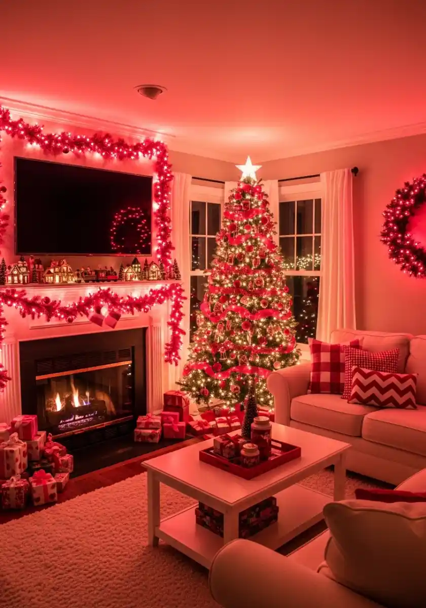 To keep it from going chaotic, stick to red textiles, like a throw and stockings. That way the rainbow lights have a buddy color to lean on. If your family loves movie nights, this christmas lights living room style is perfect. It pops with the fire, it makes gifts sparkle, and nobody argues about whether the bulbs should be warm white or cool. We got everything.