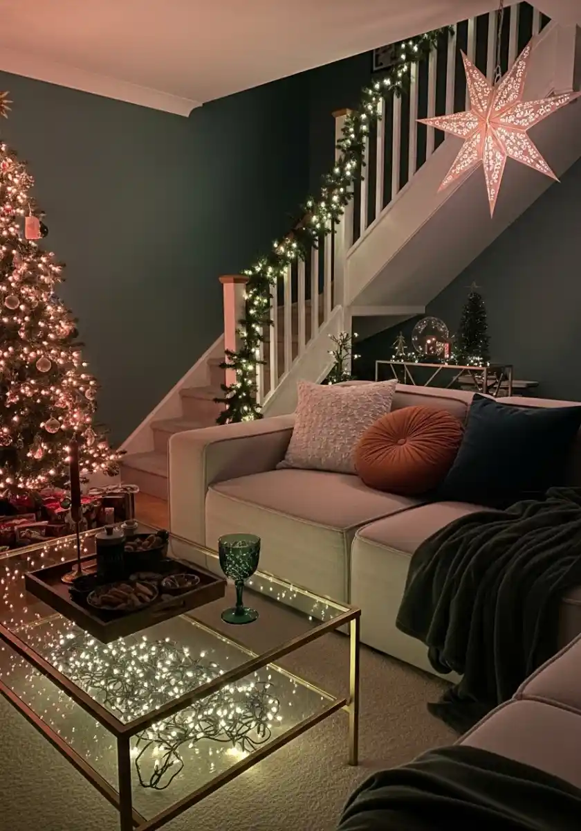 I didn’t expect the coffee table to steal the show, but the glass-top trick really works. I dropped a net of fairy lights under the glass and the reflection doubled the shine. It’s a cheap upgrade that makes the seating zone feel premium. On the stairs, I wrapped garland with living room Christmas lights and zip-tied it to the banister so it stays tidy.
