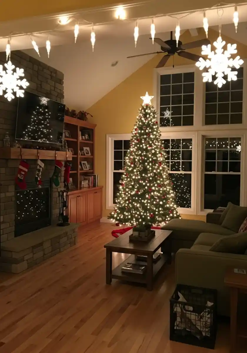If your room has a high beam or open arch, icicle lights make the space feel like a winter lodge. I clipped icicle strands along the beam and hung two large snowflake pendants near the center. The tree sits by the big windows so you get that magic reflection at night. It’s like having two trees for the price of one.