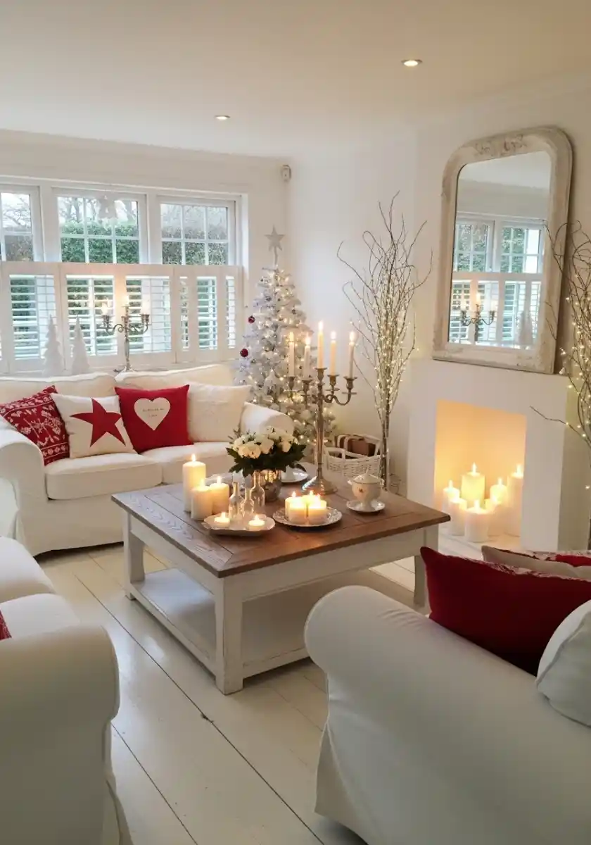 If you crave calm, this white-on-white scene is a breath. I dragged my slipcovered chairs near the window, added chunky knit pillows, and sat a small frosted tree in the corner. The trick is to let reflective things do the heavy lifting. Silver candlesticks, glass hurricanes, and a pale tray bounce the glow back into the room.