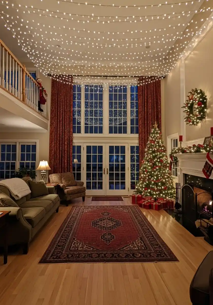 Stringing a canopy across the ceiling looks fancy, but it’s way easier than it appears. I measured the room, then used clear command hooks every ten to twelve inches to swag strands from wall to wall. The reflection in the tall windows multiplies the sparkle. It turns regular Christmas lighting in the living room into a full starfield. Keep other lamps dim so the canopy does the heavy lifting.