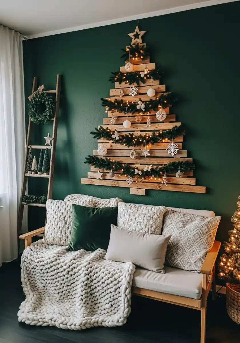 No floor space for a full spruce. Do a wall tree. This look uses stacked wood slats with short garland branches and tiny bulbs to outline the shape. I cut three lengths of scrap wood, stained them light, and attached with picture hanging strips. Then I clipped small greenery pieces and added micro fairy lights for the living room so the shape sits above the sofa like art.