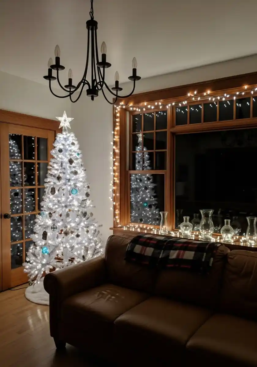 Use mantel lights for the living room along the sill with glass vases to bounce the glow. If your sofa is leather, this clean palette keeps it from feeling heavy. I like one or two aqua ornaments on the white branches for a tiny icy pop. It feels crisp, a little modern, but still soft because the bulbs are small and close together.