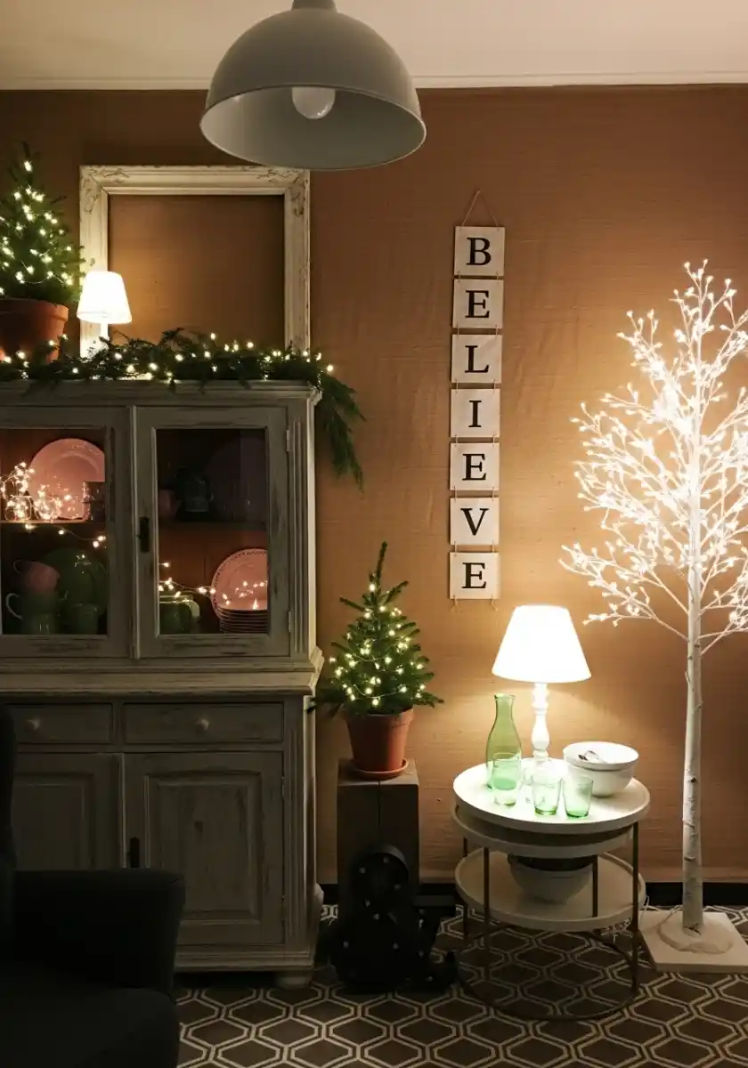 This is the fastest way to make christmas lights living room a whole experience. I like plug-in lights around the living room here because batteries die at the worst time. Keep the rest simple. A floor lamp and one soft throw is enough. The doorway frame becomes your halo and, yes, it photographs like a dream.