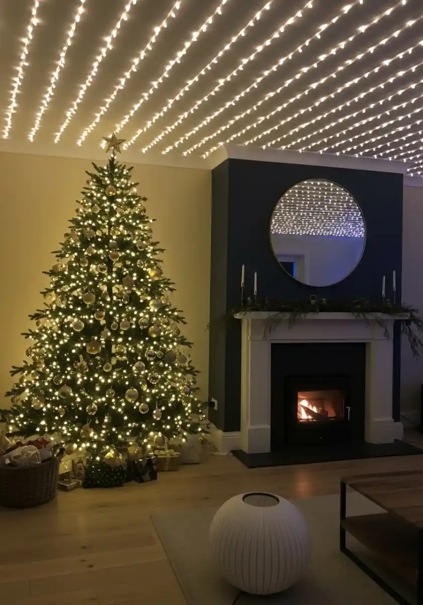 Ceiling lights for the living room Christmas are unbeatable when you want drama without clutter. Switch off every other lamp so the canopy carries the mood. Use warm white lights in the living room to keep faces soft. If you have a darker accent wall, the canopy stands out even more. It’s romantic and also kinda practical because the light spreads evenly for board games and cocoa spills.